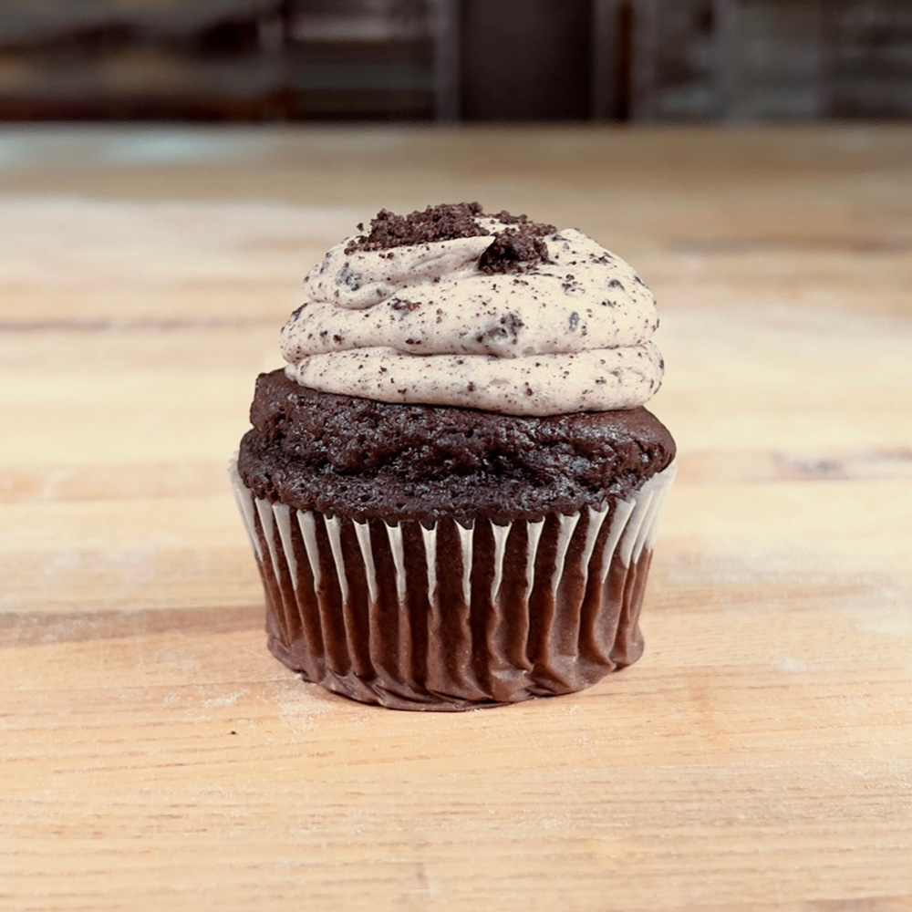 Chocolate cupcake base with a swirl of cookies and cream frosting, featuring crushed cookie pieces